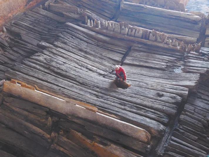经测量,这盗洞足有14.8米深,盗墓贼不仅打穿了山一样厚的封土层,还锯开了厚厚的椁板,进入到椁室内部。