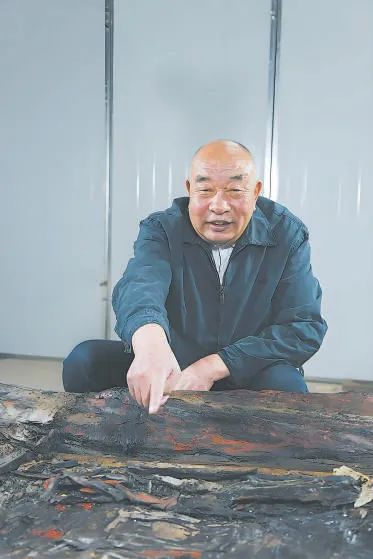 在一张流传甚广的照片中,数十根黝黑色的长条形椁板,一根根并排拼接起来,守护着椁室。杨军蹲在巨大的椁板上,显得非常渺小。他说,“我当时已经预感到会出很多宝贝,但心里一点也不高兴,反而很忐忑,就怕保护不好它们,成了罪人。”